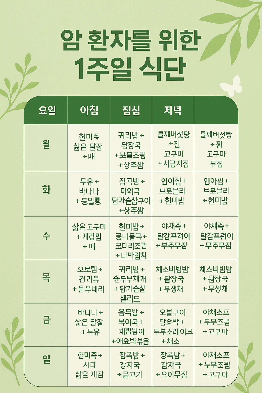 암 환자를 위한 식단은 면역력 강화, 염증 억제, 회복 촉진, 영양 균형을 목표로 구성해야 합니다. 아래는 일반적인 기준(소화가 가능한 상태, 항암치료 중 또는 이후 상태)에 맞춘 암 환자용 일주일 식단 예시입니다.
